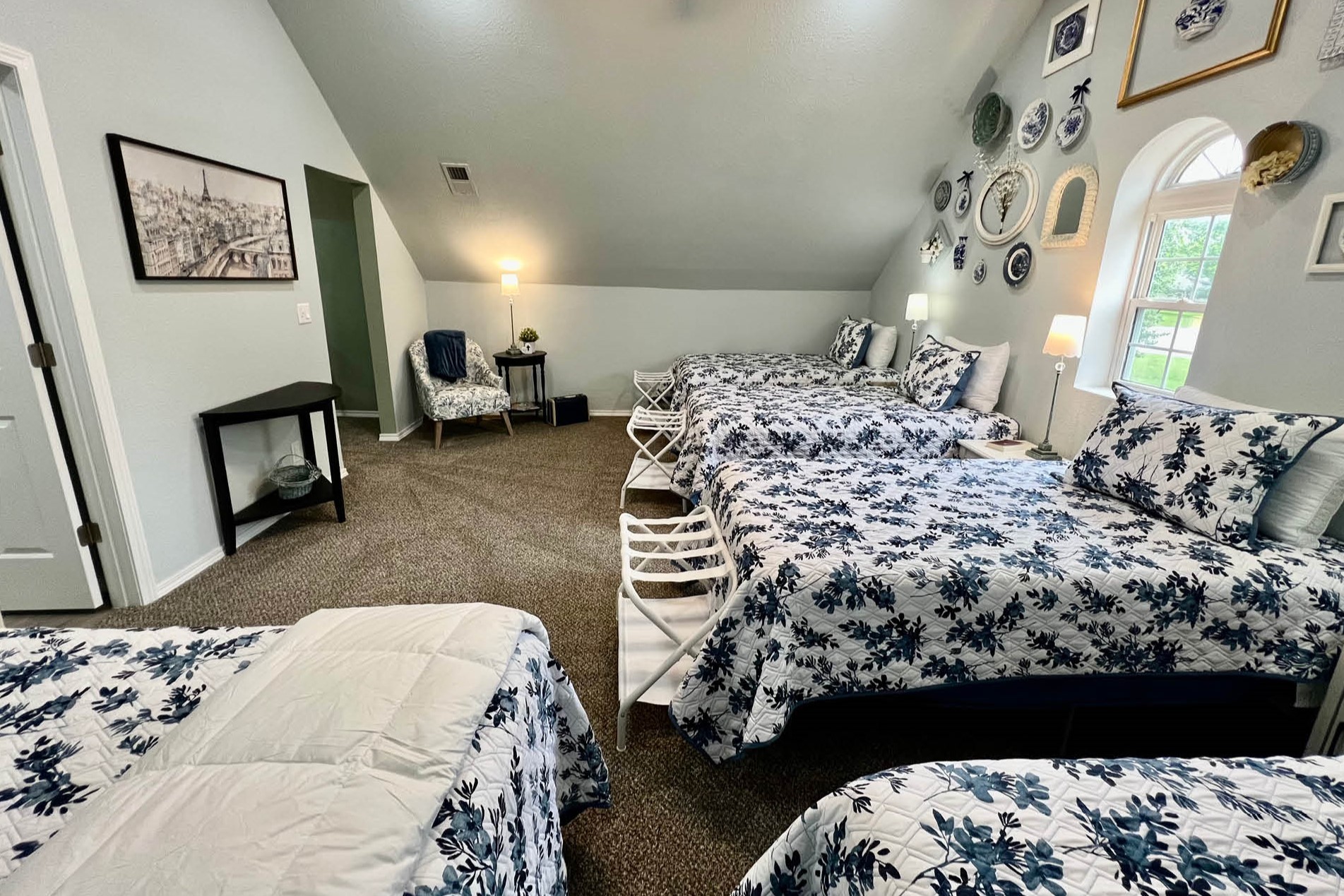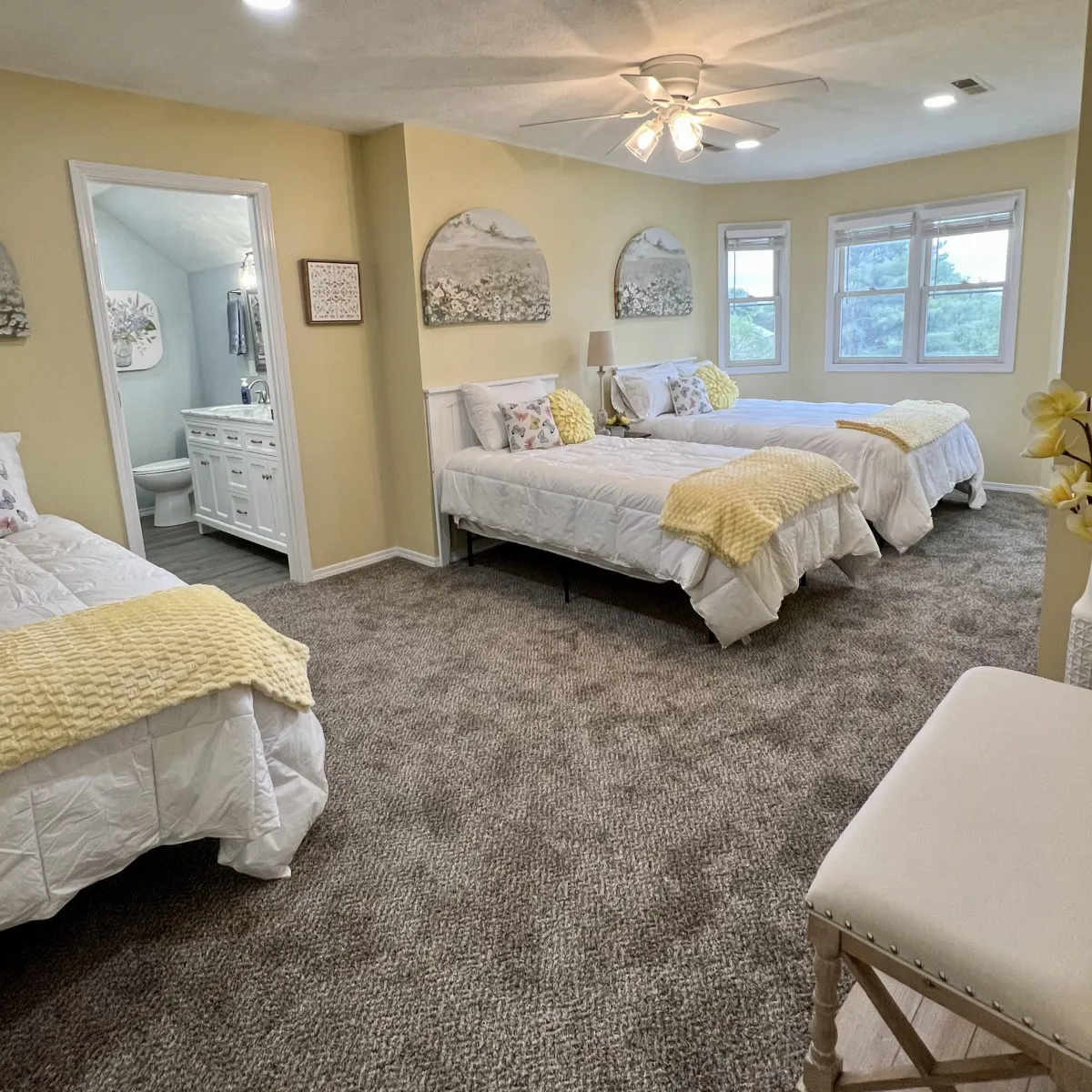 We have 4 beautifully decorated bedrooms and 3 1/2 new bathrooms. A separate cozy tv room, a classroom, well appointed kitchen, eating nook, two bright craft spaces, large outdoor deck and country front porch. We are excited for you to join us and experience for yourself the luxury that awaits you at the Ozark Creative Cottage.